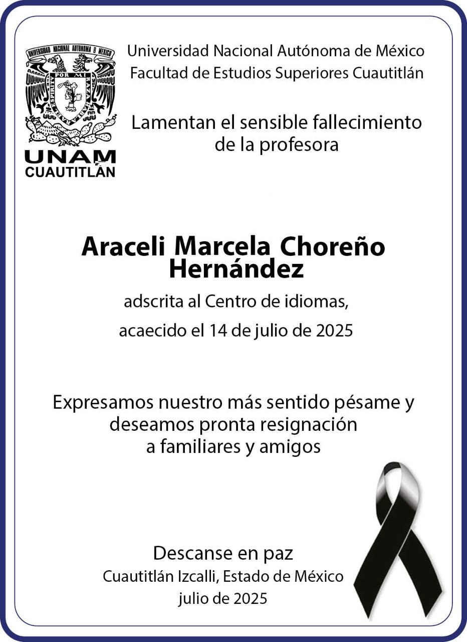 on mucho pesar, la familia Hernández Palacios lamenta e informa el sorpresivo y sensible fallecimiento de Araceli Marcela Choreño Hernández el lunes 14 de julio de 2025. Será muy apreciado el elevar una oración en su memoria.