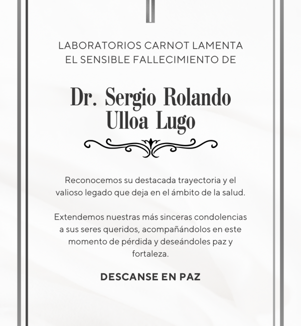 aboratorios Carnot se une a la pena que embarga a la familia del Dr. Sergio Rolanco Ulloa Lugo, reconociendo su destacada trayectoria y el legado que deja en el ámbito de la salud.